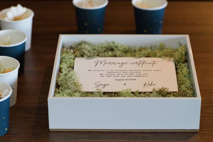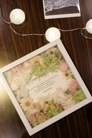ゲストひとりひとりにお花を敷き詰めてもらい完成させた結婚証明書。